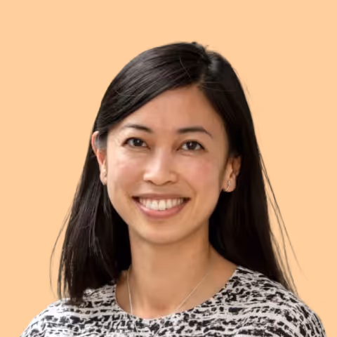 Smiling woman with long light brown hair wearing a dark pinstripe blazer against a peach background.